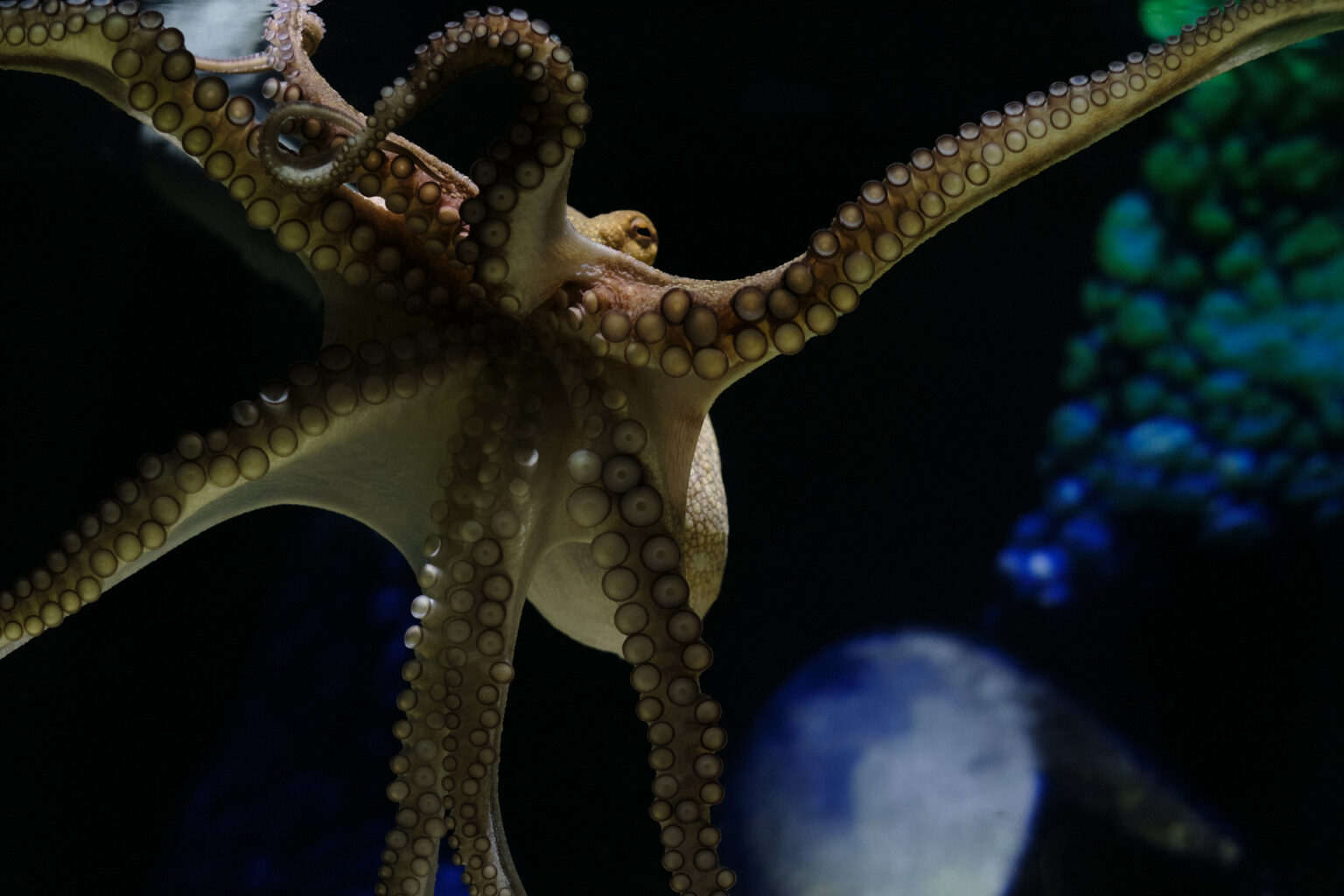 Stefan Kaegi: That agility and curiosity, I wasn’t expecting that. When Judith, Nathalie and I went to Paris to see the octopus in the aquarium, we saw an animal that hardly moved at all, until the very last moment when its keeper arrived and fed it. There is an enormous difference between an animal that is observed by, let’s say, ten children every five minutes spending perhaps half a minute looking at the octopus without producing any special reaction in it. Compared to the quality of the relationships that the octopuses develop, particularly with Judith and Nathalie, but also with me when I go to see them. It seems to me that, in scientific research, we often want to avoid too many interactions to not disturb the analysis. On the other hand, during the months of rehearsals, I think I saw relationships develop with two singular individuals. And during most of the rehearsals, the octopuses were very active and curious. For me, as a director, it’s a catastrophe to work with a protagonist that is not at all predictable. And at the same time, it’s a tremendous gift. In theatre, unlike in film, every performance is different, it plays out differently every night. With the octopus, this is taken to the extreme, because in this show, it is the animal that decides what it wants or doesn’t want to do. The octopuses are not trained. They define much of the action, interaction and dramaturgy of this show and it is new every night. The theatre and the performers will have to adapt to that. But it must be said, and I didn’t expect this either, that these two octopuses seem to be aware of the state of concentration of rehearsal. I have the impression that it’s really something different when you’re there in the afternoon, even when you put the lights on as if it were really the show. It’s a different concentration than in the evening, when there’s audio, when everyone is in the space and the eight people who are there during the rehearsals are focused on that. It seems that there are certain parameters, certain behaviors that are repeated in this situation. Is this comparable to the situation we will have with an audience?
